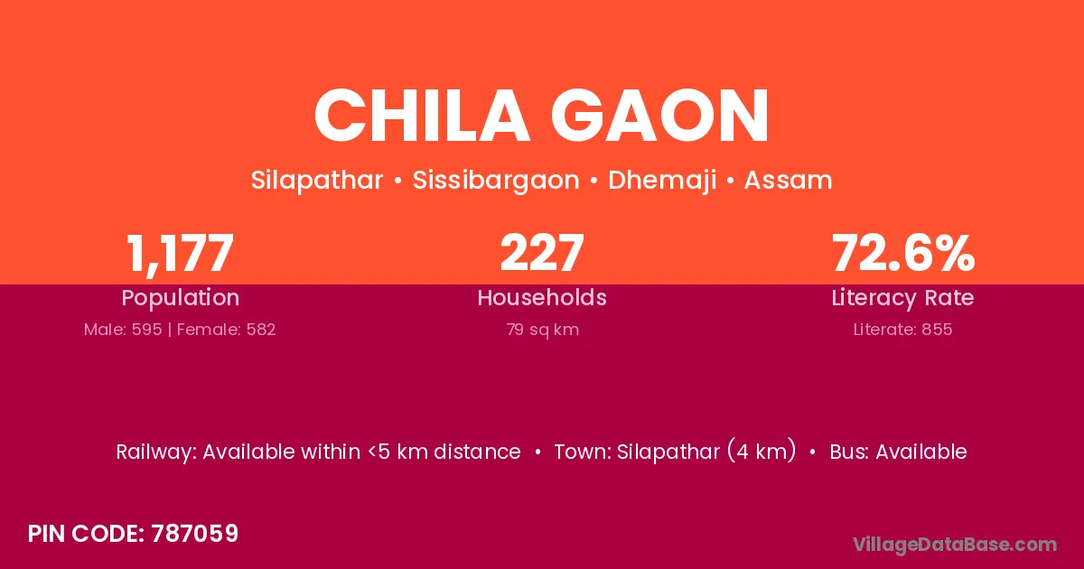 Silapathar (4 km) is the nearest town to Chila Gaon village for major economic activities and is located approximately 4 km away.