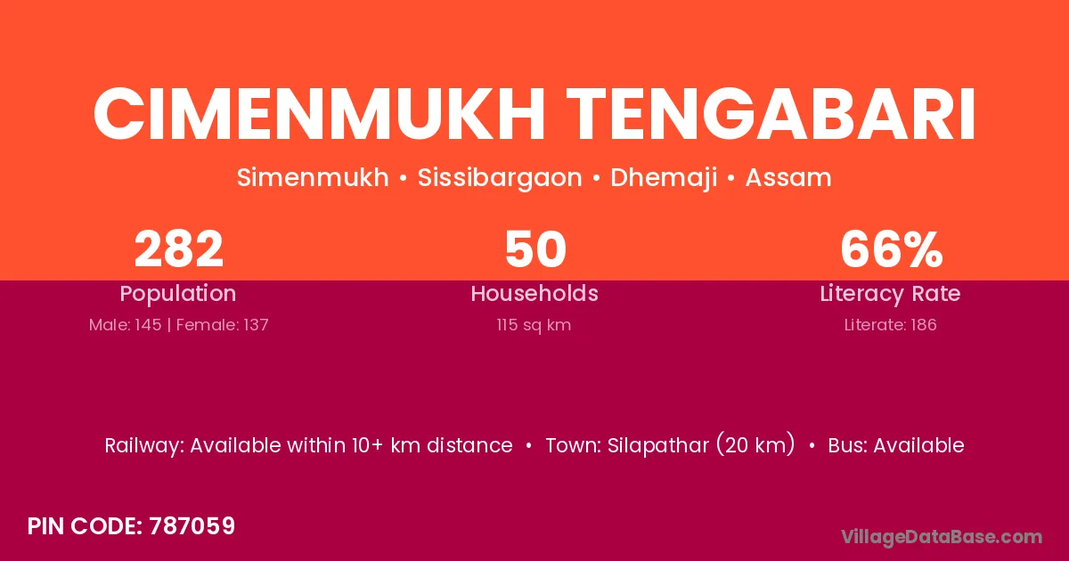 Silapathar (20 km) is the nearest town to Cimenmukh Tengabari village for major economic activities and is located approximately 20 km away.