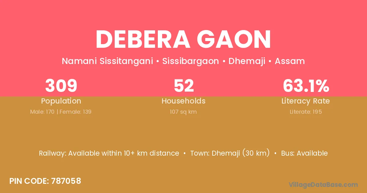 Dhemaji (30 km) is the nearest town to Debera Gaon village for major economic activities and is located approximately 30 km away.