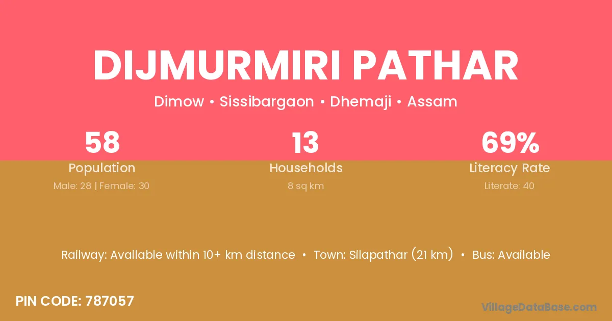 Silapathar (21 km) is the nearest town to Dijmurmiri Pathar village for major economic activities and is located approximately 21 km away.
