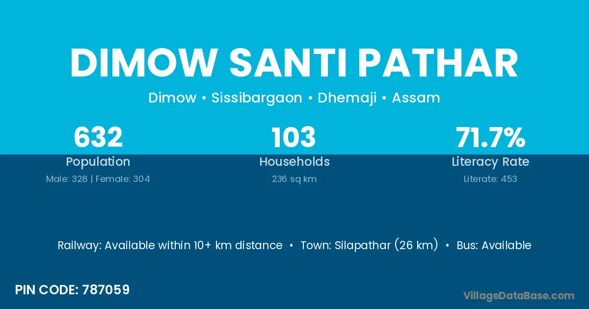 Silapathar (26 km) is the nearest town to Dimow Santi Pathar village for major economic activities and is located approximately 26 km away.
