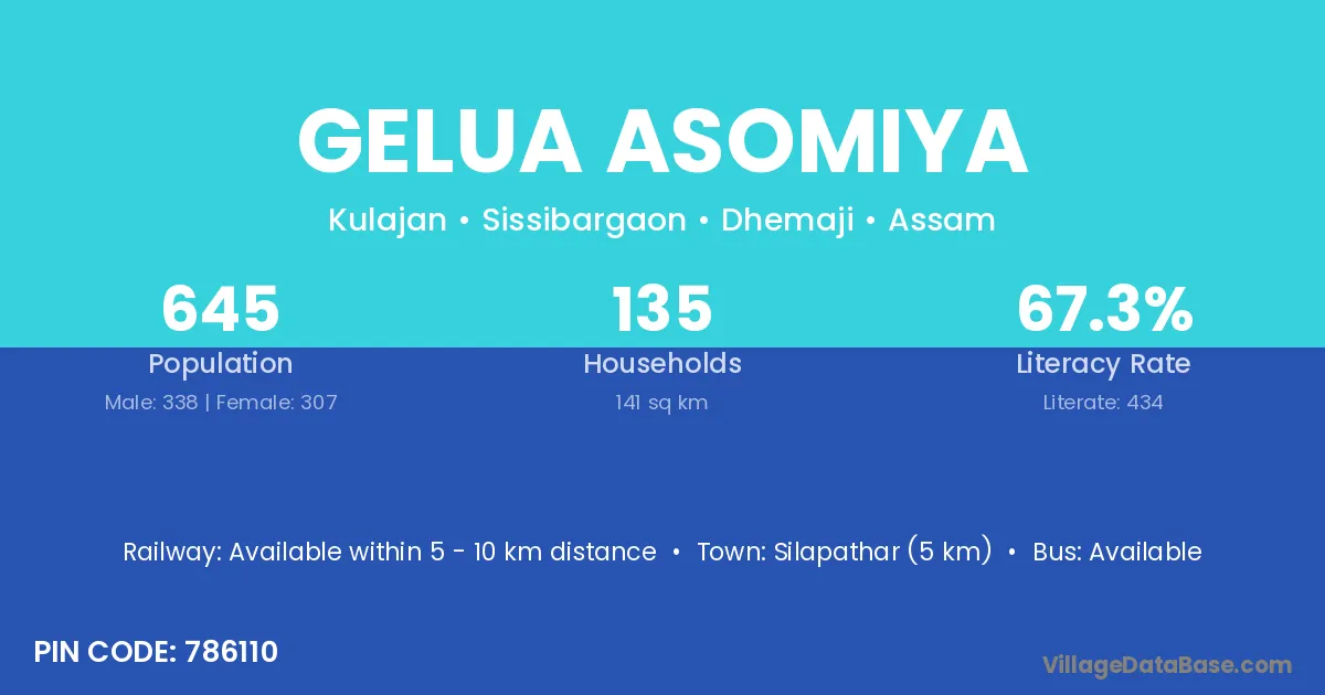 Gelua Asomiya village has a total population of 645 people, of which 338 are males and 307 are females.