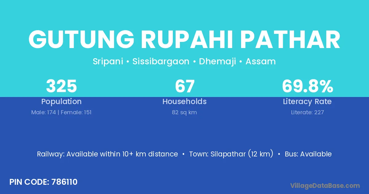 Silapathar (12 km) is the nearest town to Gutung Rupahi Pathar village for major economic activities and is located approximately 12 km away.