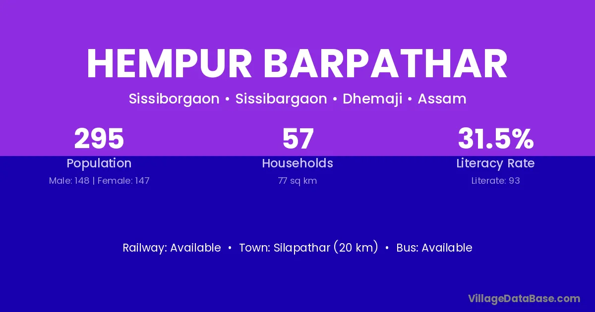 Silapathar (20 km) is the nearest town to Hempur Barpathar village for major economic activities and is located approximately 20 km away.
