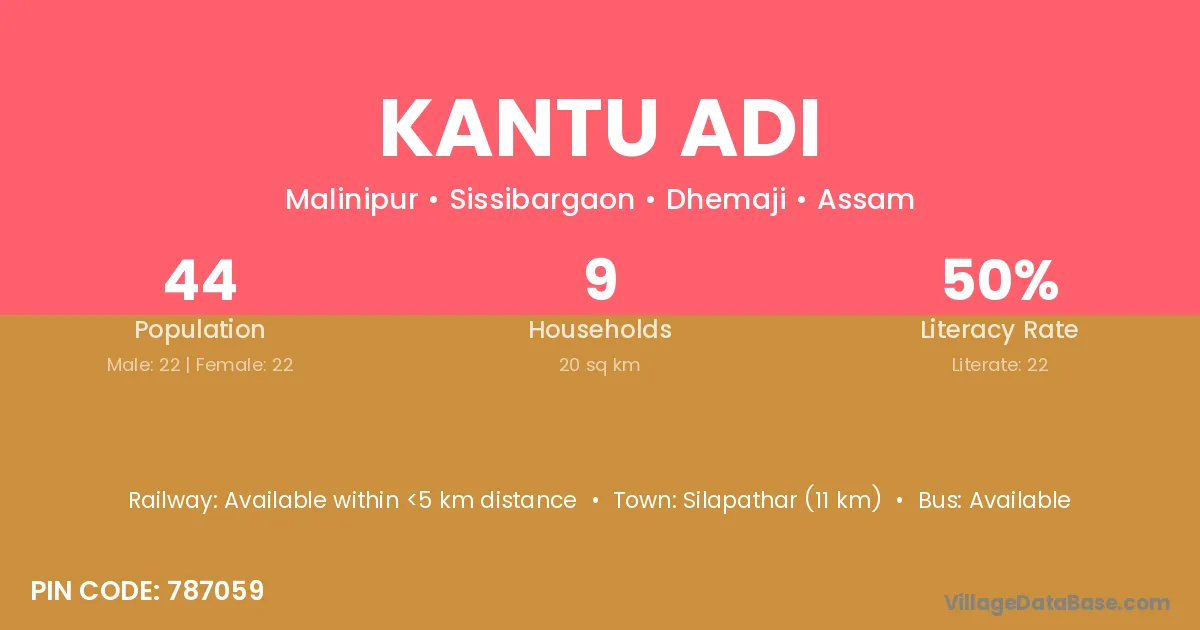 Silapathar (11 km) is the nearest town to Kantu Adi village for major economic activities and is located approximately 11 km away.