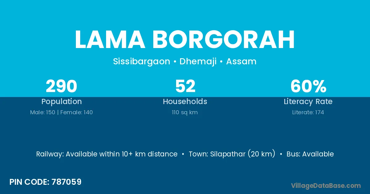 Silapathar (20 km) is the nearest town to Lama Borgorah village for major economic activities and is located approximately 20 km away.