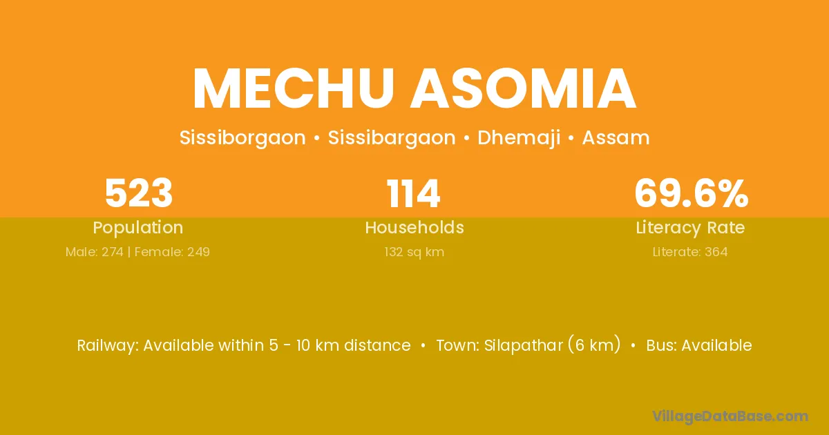 Silapathar (6 km) is the nearest town to Mechu Asomia village for major economic activities and is located approximately 6 km away.