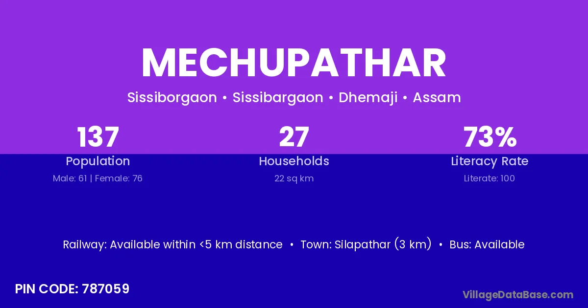 Silapathar (3 km) is the nearest town to Mechupathar village for major economic activities and is located approximately 3 km away.