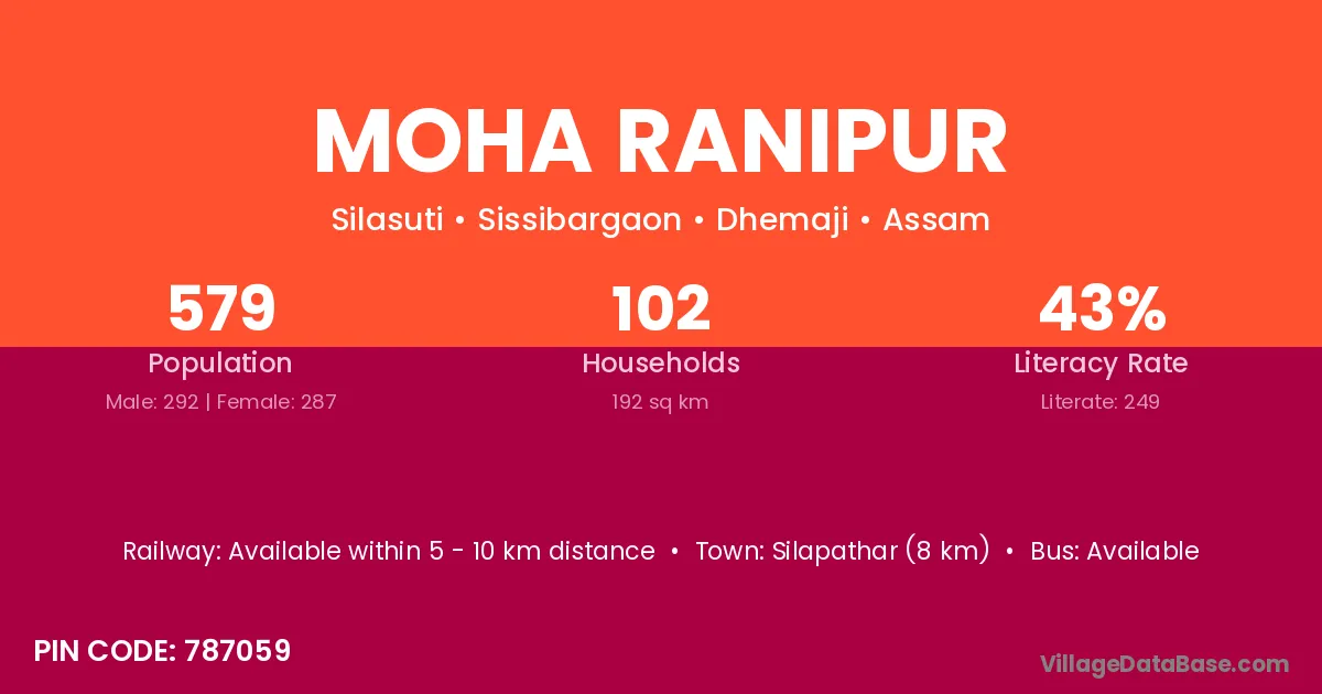 Silapathar (8 km) is the nearest town to Moha Ranipur village for major economic activities and is located approximately 8 km away.