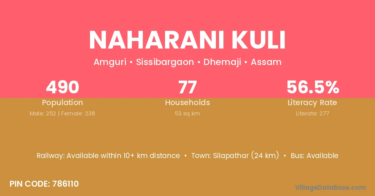 Naharani Kuli village has a total population of 490 people, of which 252 are males and 238 are females.