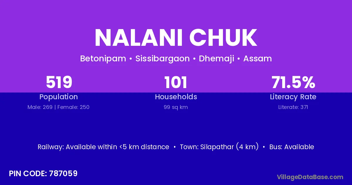 Silapathar (4 km) is the nearest town to Nalani Chuk village for major economic activities and is located approximately 4 km away.