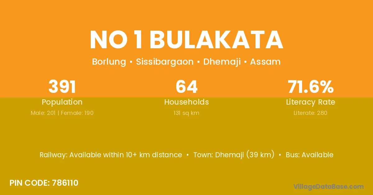 Dhemaji (39 km) is the nearest town to No 1 Bulakata village for major economic activities and is located approximately 39 km away.