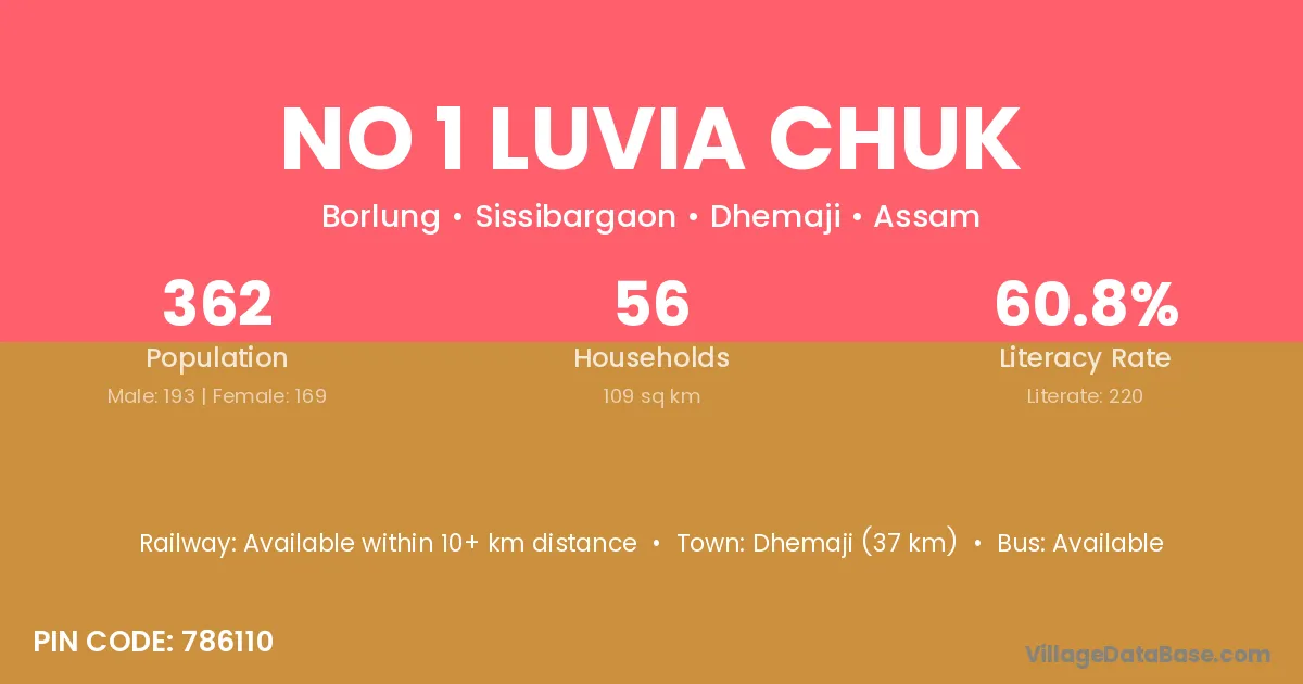 Dhemaji (37 km) is the nearest town to No 1 Luvia Chuk village for major economic activities and is located approximately 37 km away.