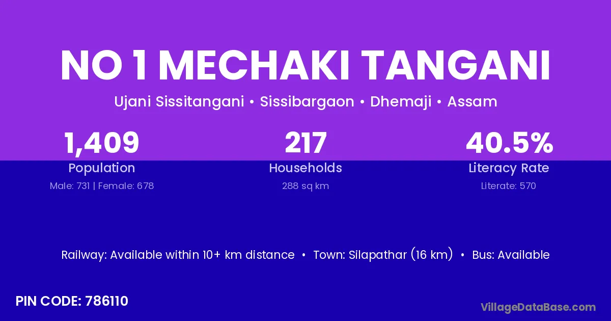 Silapathar (16 km) is the nearest town to No 1 Mechaki Tangani village for major economic activities and is located approximately 16 km away.