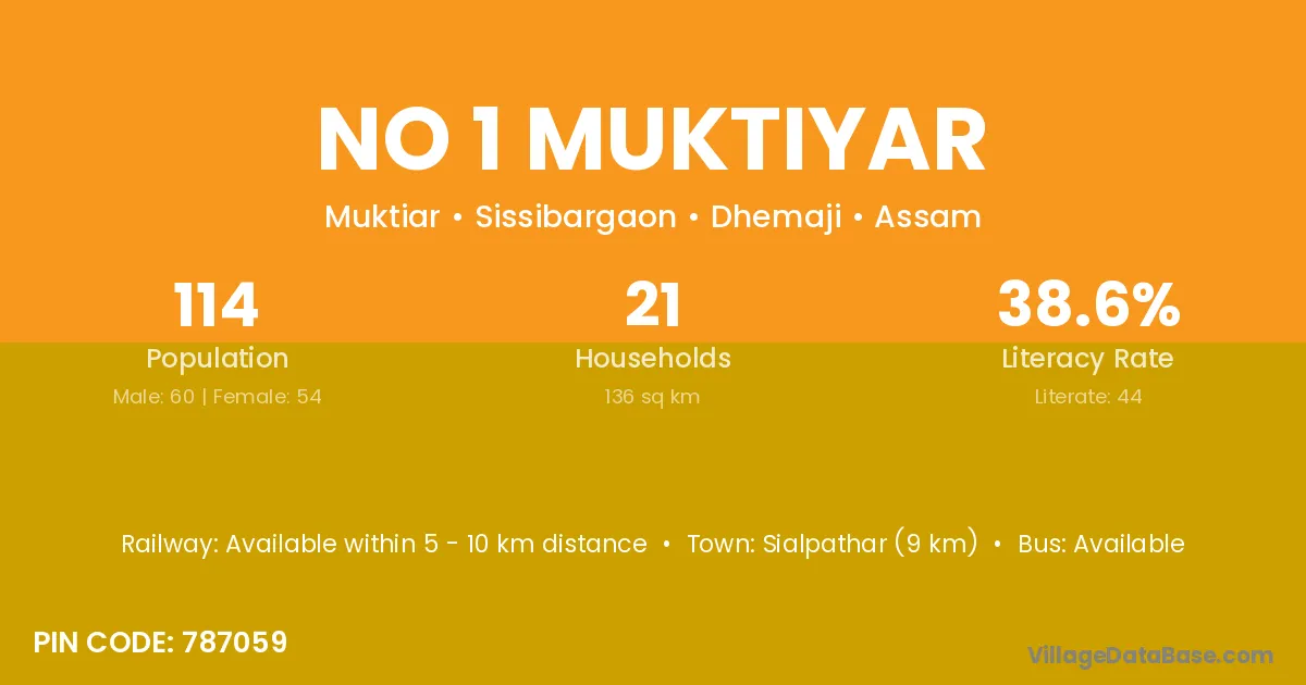 No 1 Muktiyar village has a total population of 114 people, of which 60 are males and 54 are females.