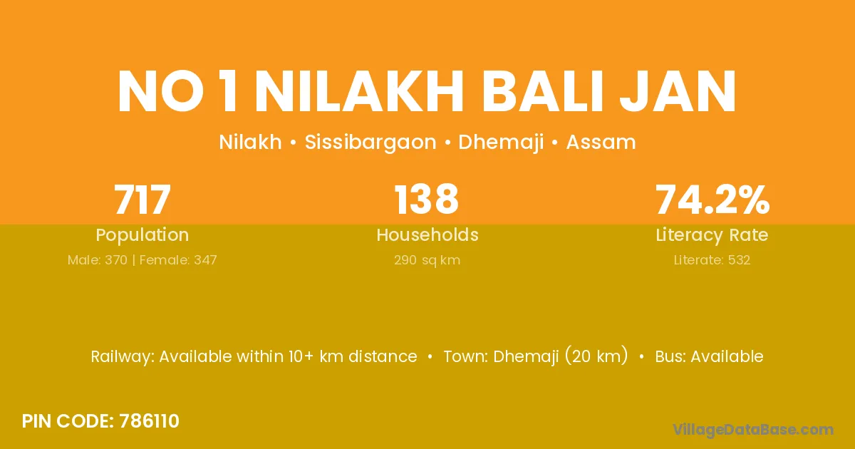 Dhemaji (20 km) is the nearest town to No 1 Nilakh Bali Jan village for major economic activities and is located approximately 20 km away.