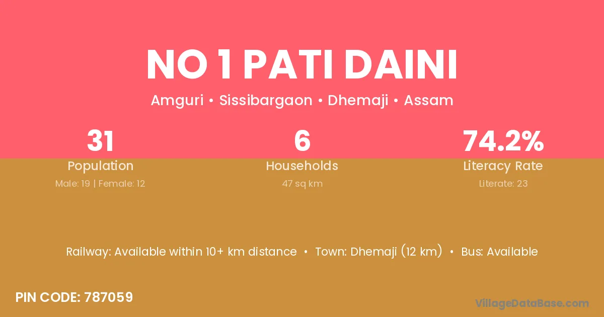 Dhemaji (12 km) is the nearest town to No 1 Pati Daini village for major economic activities and is located approximately 12 km away.