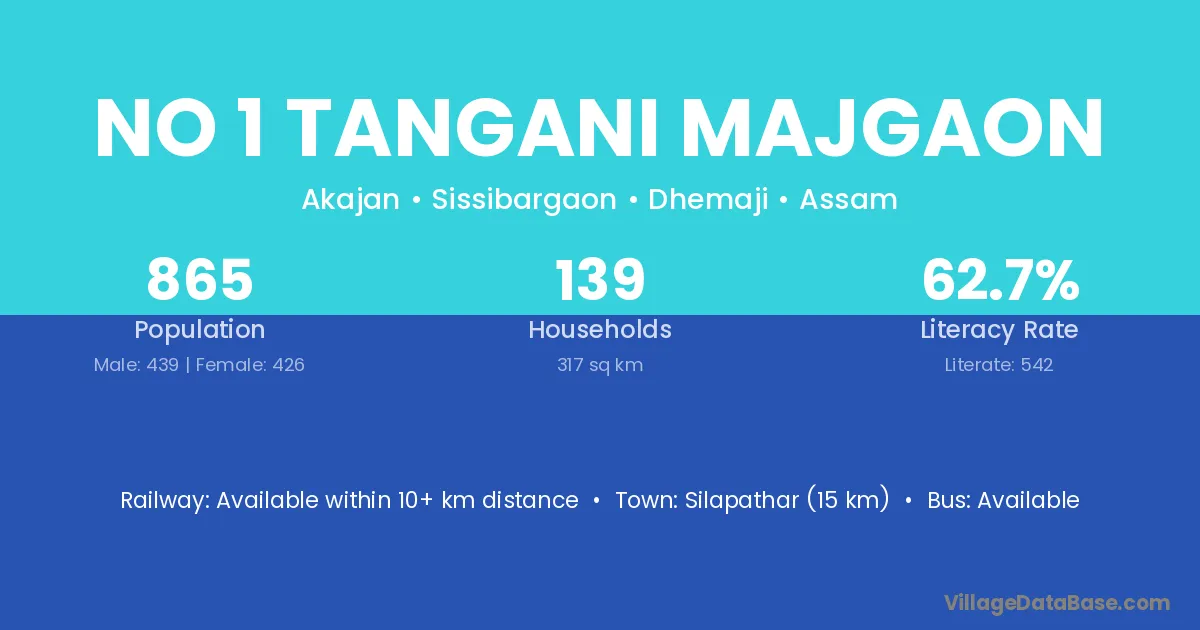Silapathar (15 km) is the nearest town to No 1 Tangani Majgaon village for major economic activities and is located approximately 15 km away.