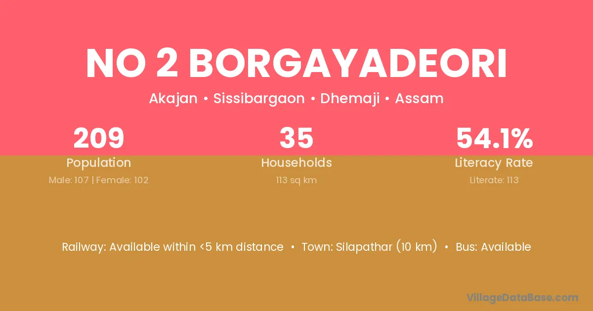 No 2 Borgayadeori village has a total population of 209 people, of which 107 are males and 102 are females.