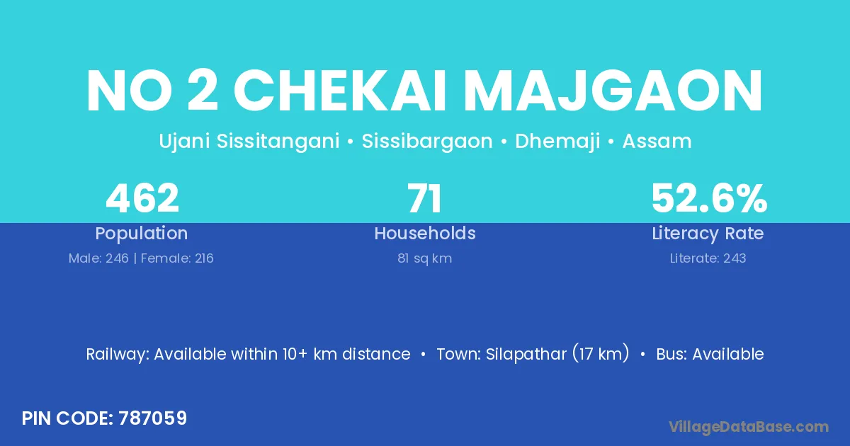 Silapathar (17 km) is the nearest town to No 2 Chekai Majgaon village for major economic activities and is located approximately 17 km away.
