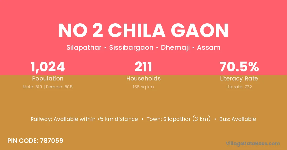 Silapathar (3 km) is the nearest town to No 2 Chila Gaon village for major economic activities and is located approximately 3 km away.