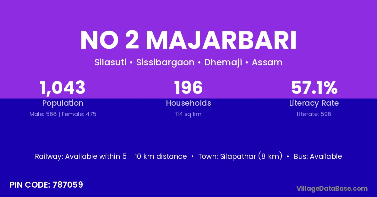 Silapathar (8 km) is the nearest town to No 2 Majarbari village for major economic activities and is located approximately 8 km away.