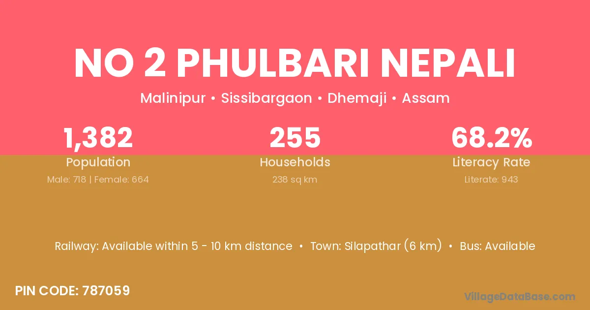 Silapathar (6 km) is the nearest town to No 2 Phulbari Nepali village for major economic activities and is located approximately 6 km away.