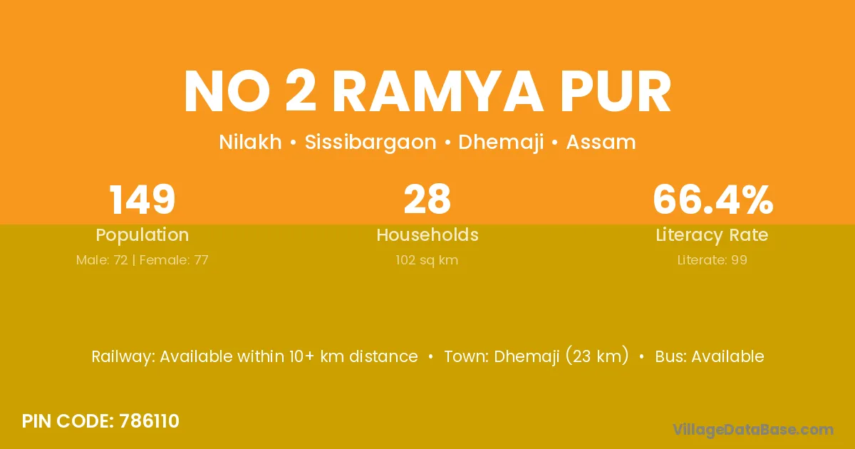 Dhemaji (23 km) is the nearest town to No 2 Ramya Pur village for major economic activities and is located approximately 23 km away.