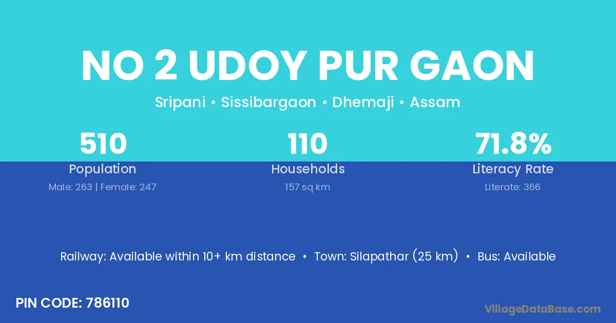 Silapathar (25 km) is the nearest town to No 2 Udoy Pur Gaon village for major economic activities and is located approximately 25 km away.