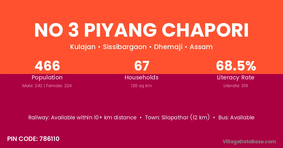 Silapathar (12 km) is the nearest town to No 3 Piyang Chapori village for major economic activities and is located approximately 12 km away.