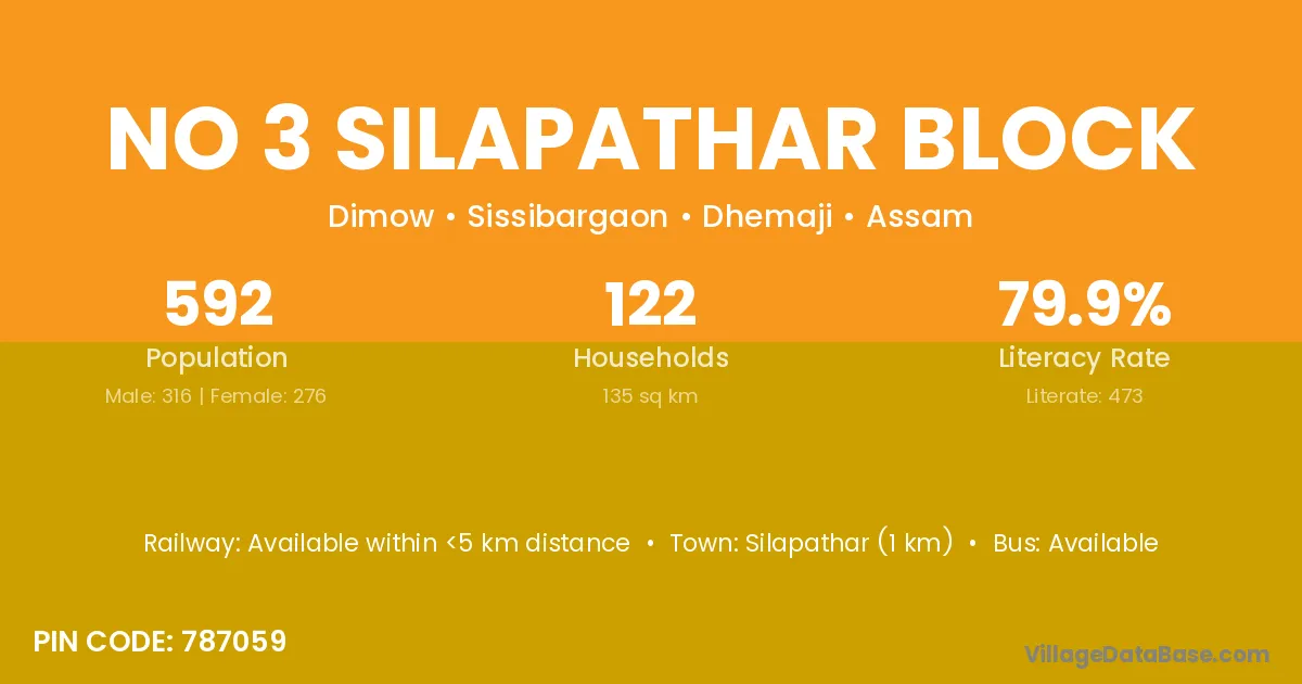 No 3 Silapathar Block village has a total population of 592 people, of which 316 are males and 276 are females.