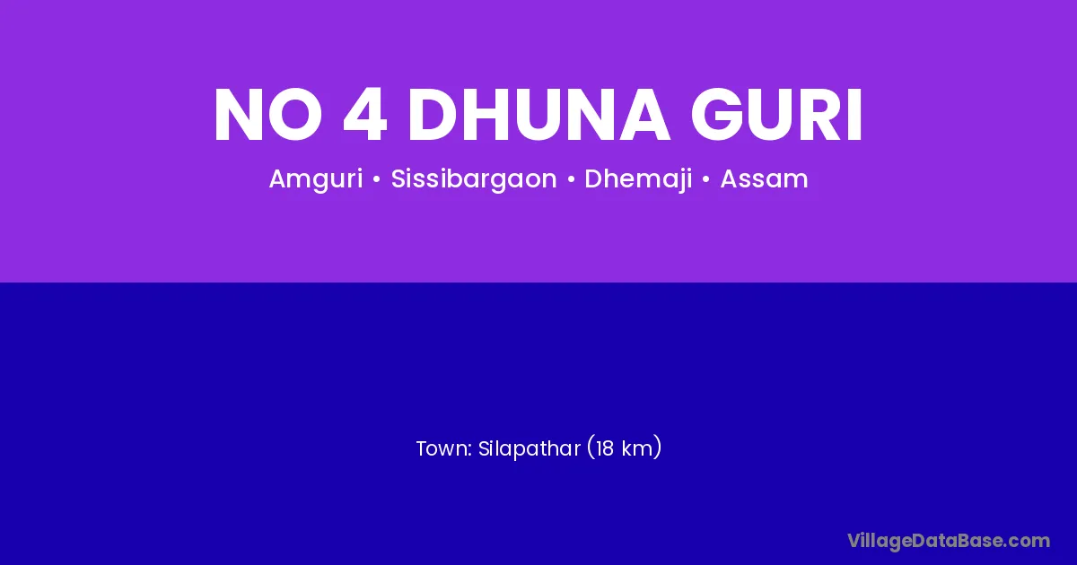 Silapathar (18 km) is the nearest town to No 4 Dhuna Guri village for major economic activities and is located approximately 18 km away.