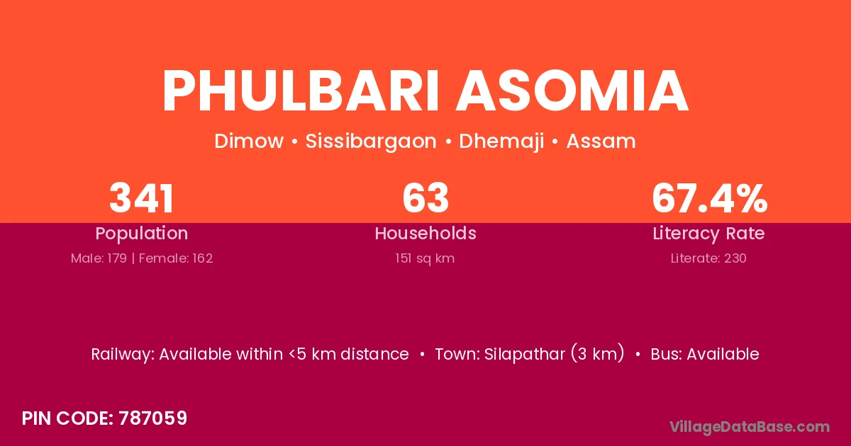 Silapathar (3 km) is the nearest town to Phulbari Asomia village for major economic activities and is located approximately 3 km away.