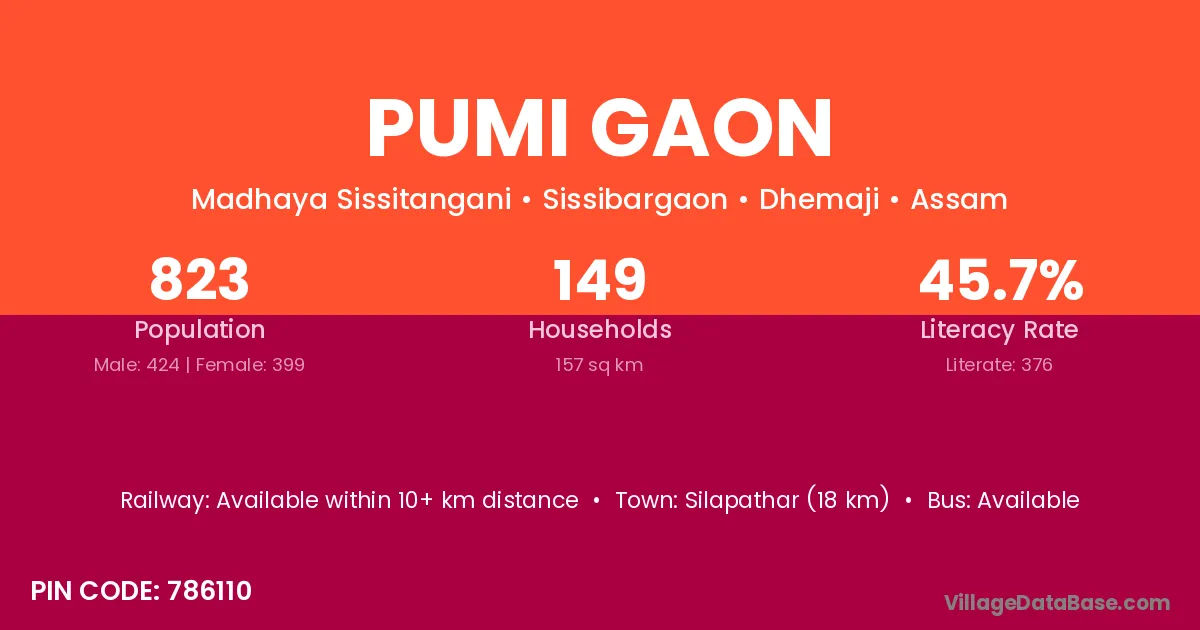 Silapathar (18 km) is the nearest town to Pumi Gaon village for major economic activities and is located approximately 18 km away.
