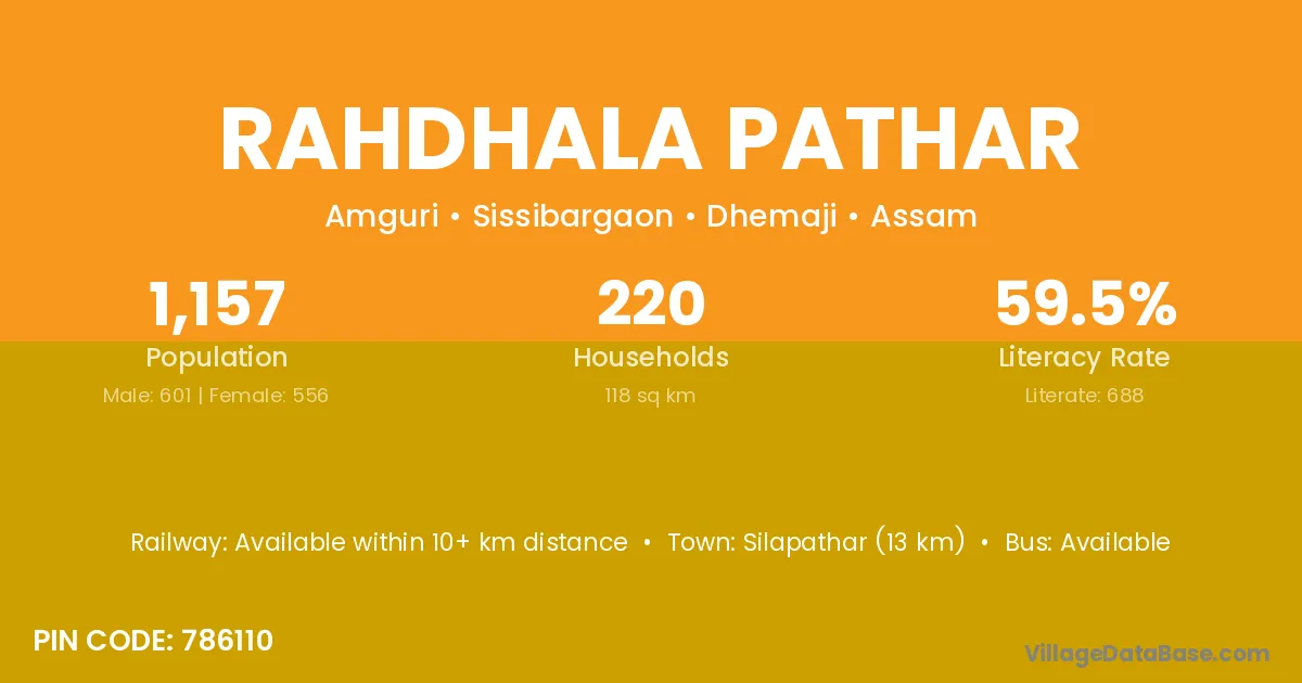Silapathar (13 km) is the nearest town to Rahdhala Pathar village for major economic activities and is located approximately 13 km away.