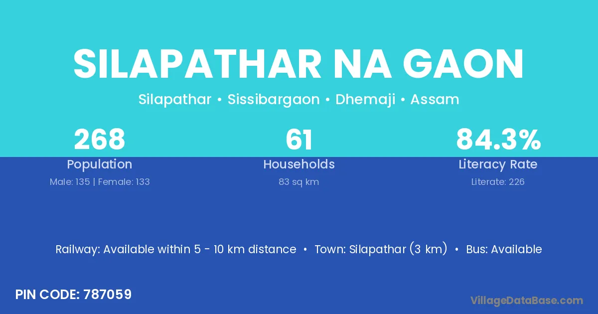Silapathar (3 km) is the nearest town to Silapathar Na Gaon village for major economic activities and is located approximately 3 km away.