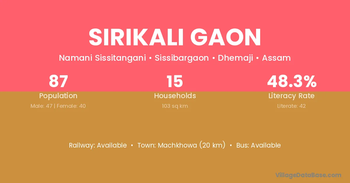 Sirikali Gaon village has a total population of 87 people, of which 47 are males and 40 are females.