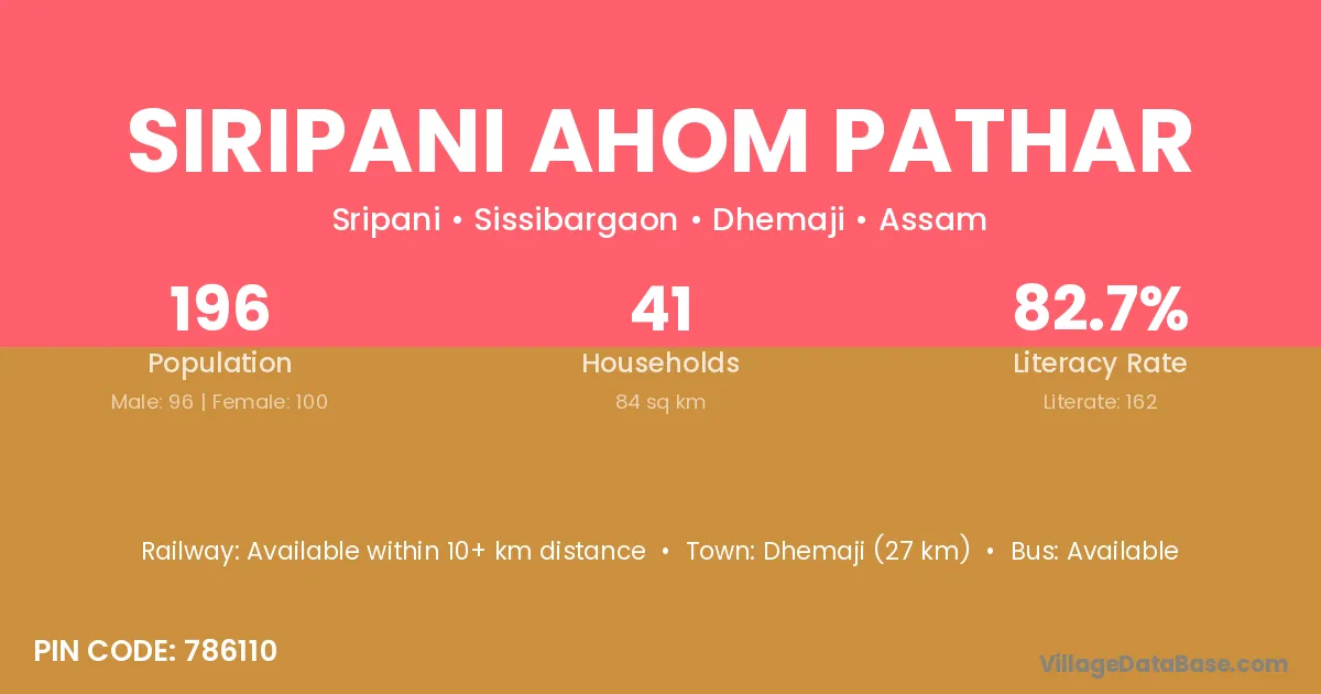 Siripani Ahom Pathar village has a total population of 196 people, of which 96 are males and 100 are females.