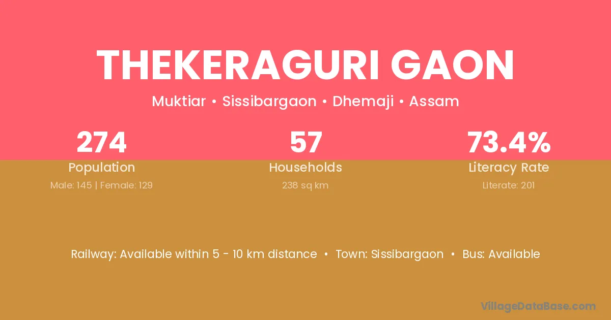 Thekeraguri Gaon village has a total population of 274 people, of which 145 are males and 129 are females.