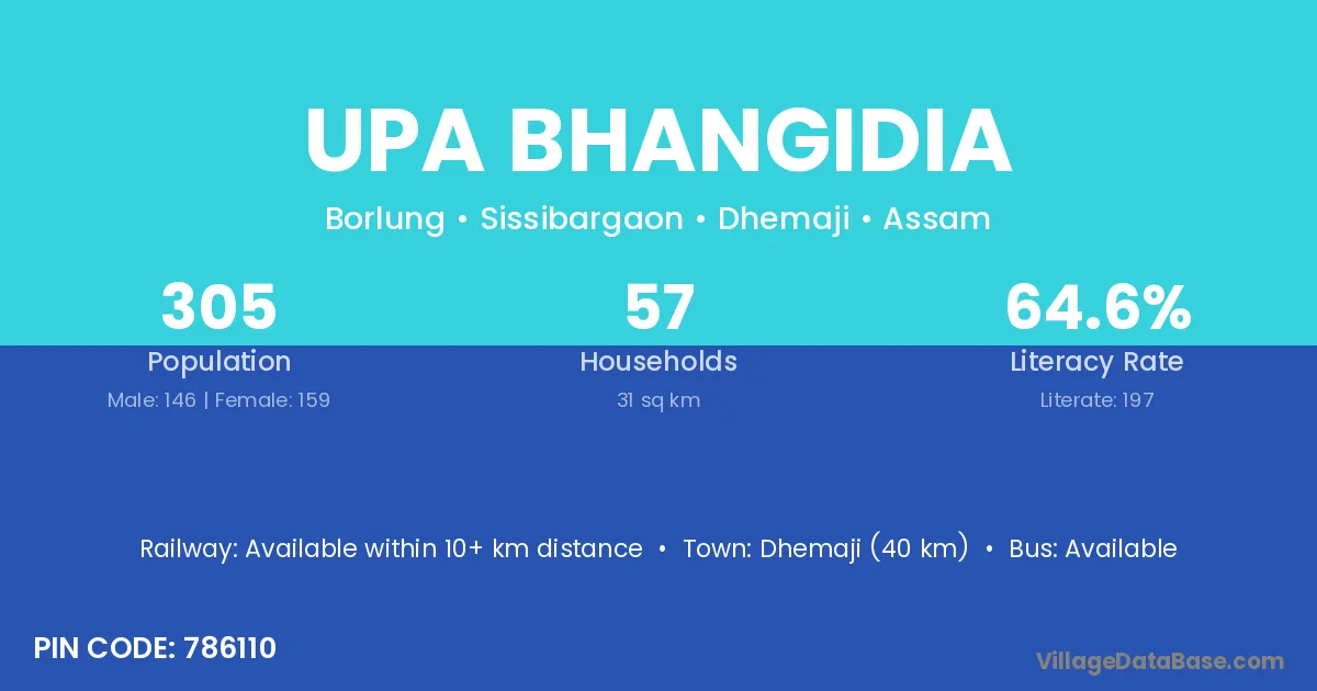 Dhemaji (40 km) is the nearest town to Upa Bhangidia village for major economic activities and is located approximately 40 km away.