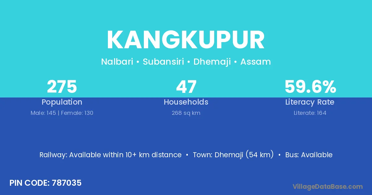 Dhemaji (54 km) is the nearest town to Kangkupur village for major economic activities and is located approximately 54 km away.