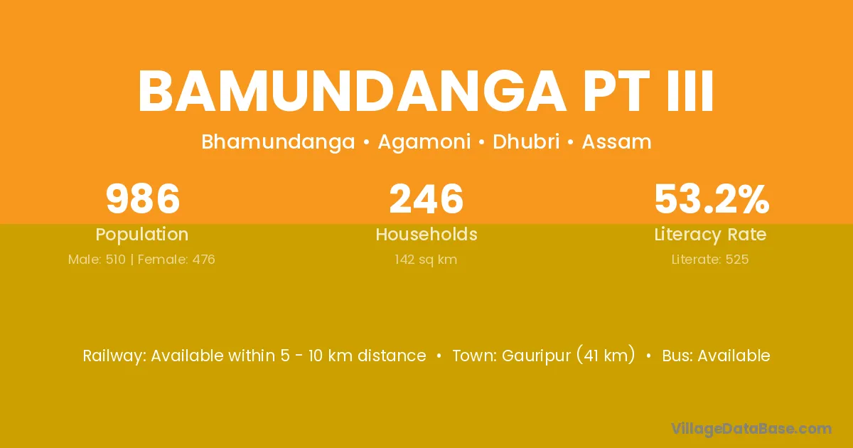Bamundanga Pt Iii village has a total population of 986 people, of which 510 are males and 476 are females.