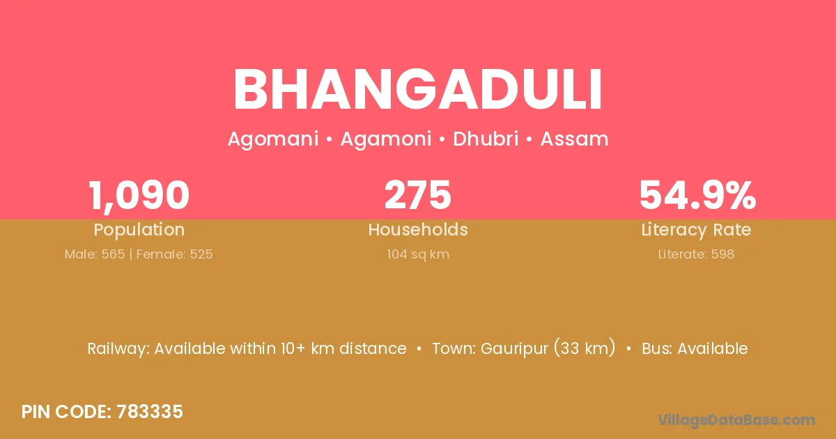 Gauripur (33 km) is the nearest town to Bhangaduli village for major economic activities and is located approximately 33 km away.