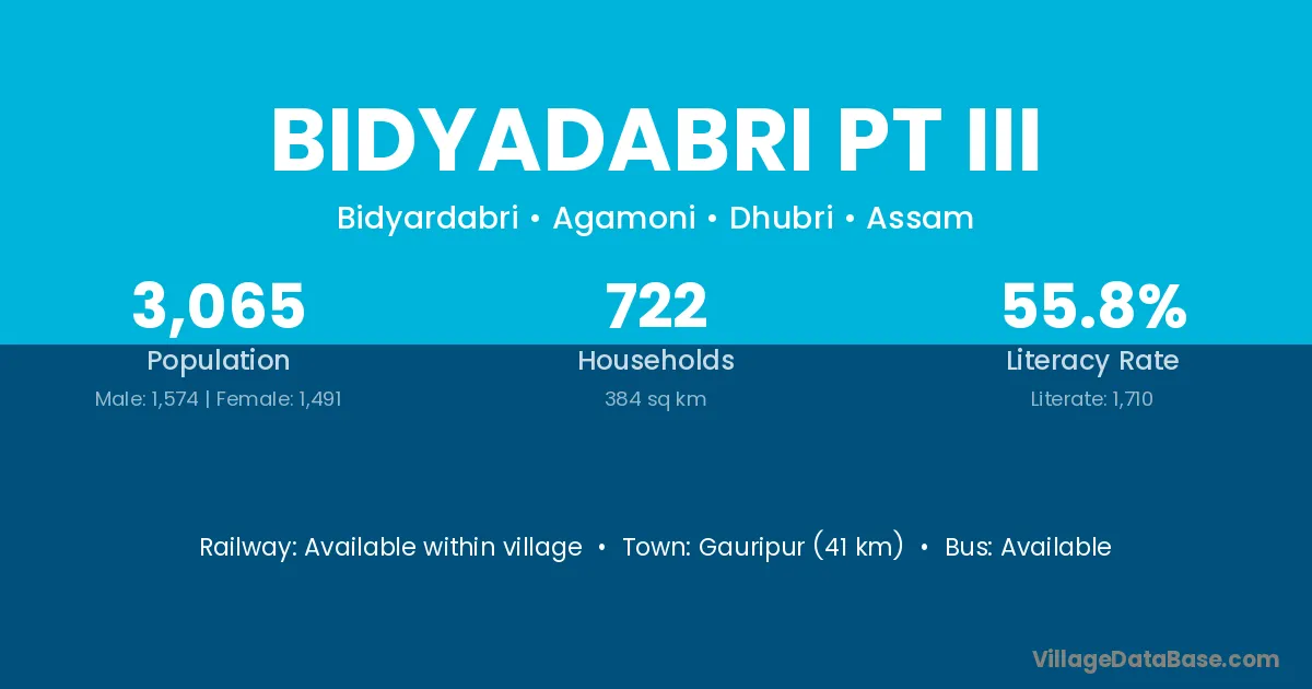 Gauripur (41 km) is the nearest town to Bidyadabri Pt Iii village for major economic activities and is located approximately 41 km away.