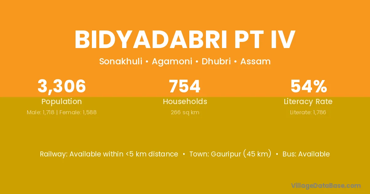 Gauripur (45 km) is the nearest town to Bidyadabri Pt Iv village for major economic activities and is located approximately 45 km away.