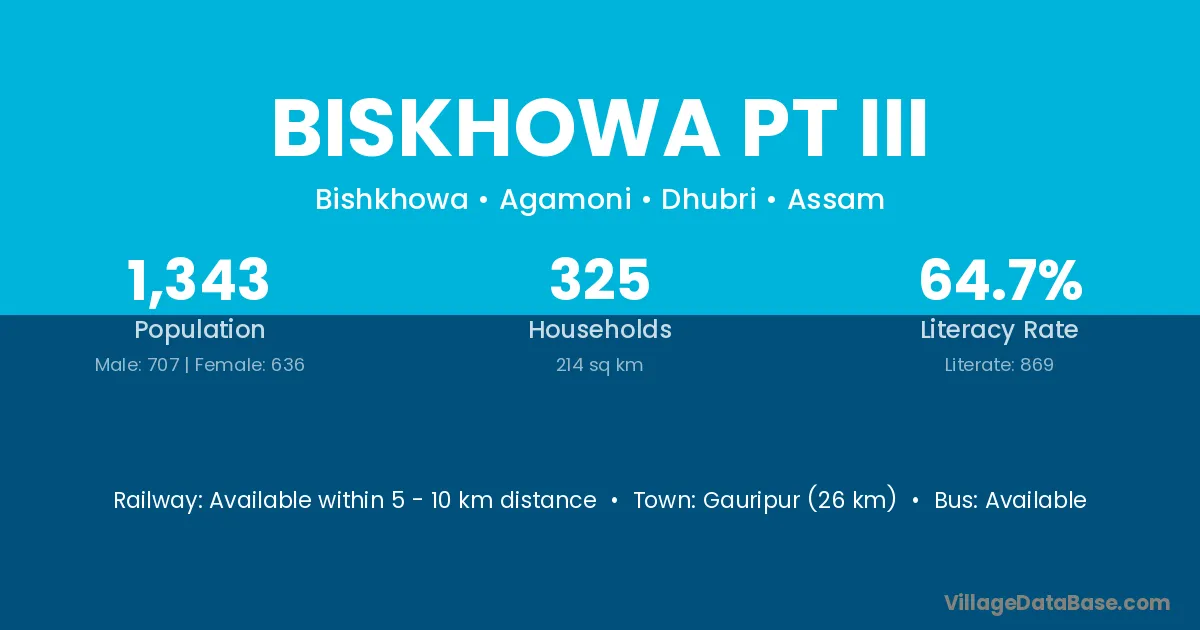 Gauripur (26 km) is the nearest town to Biskhowa Pt Iii village for major economic activities and is located approximately 26 km away.
