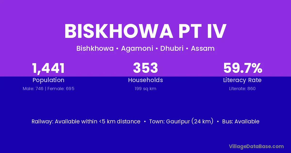 Gauripur (24 km) is the nearest town to Biskhowa Pt Iv village for major economic activities and is located approximately 24 km away.