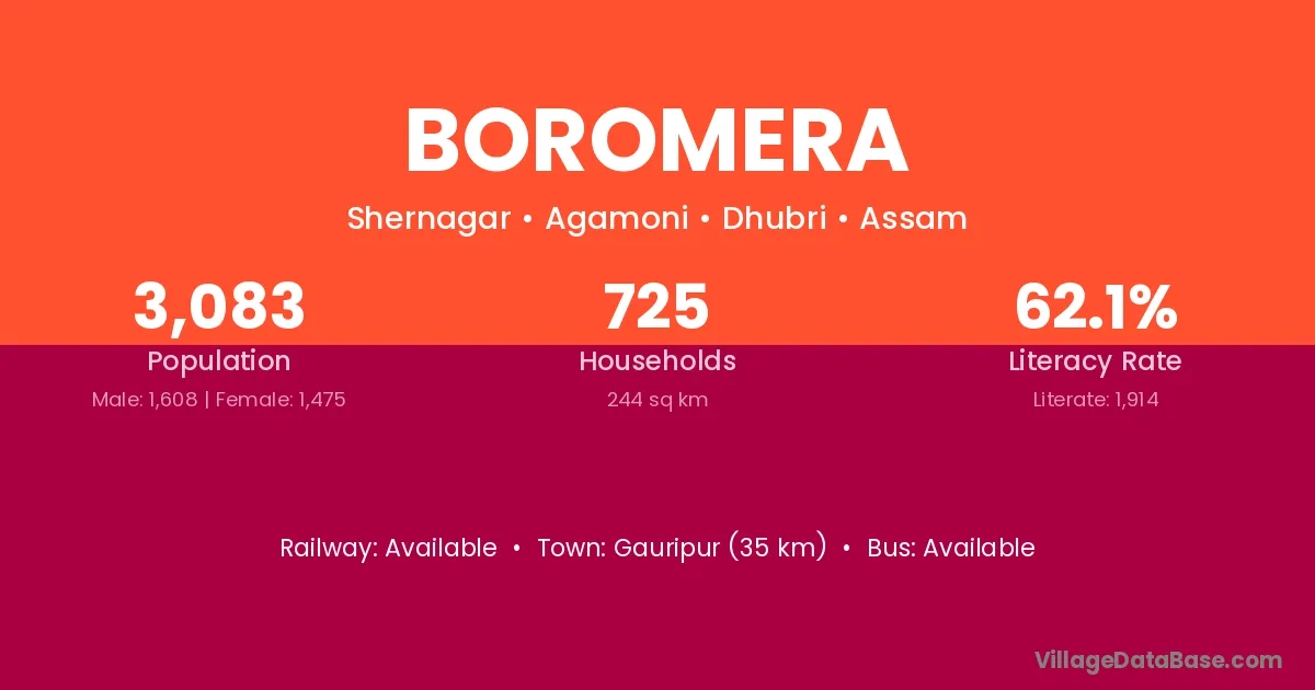 Gauripur (35 km) is the nearest town to Boromera village for major economic activities and is located approximately 35 km away.