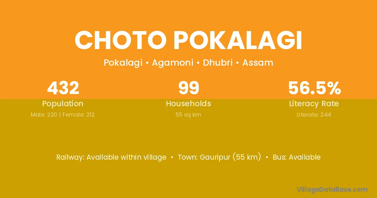 Choto Pokalagi village has a total population of 432 people, of which 220 are males and 212 are females.