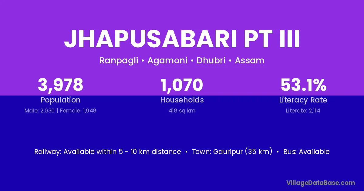 Jhapusabari Pt Iii village has a total population of 3,978 people, of which 2,030 are males and 1,948 are females.